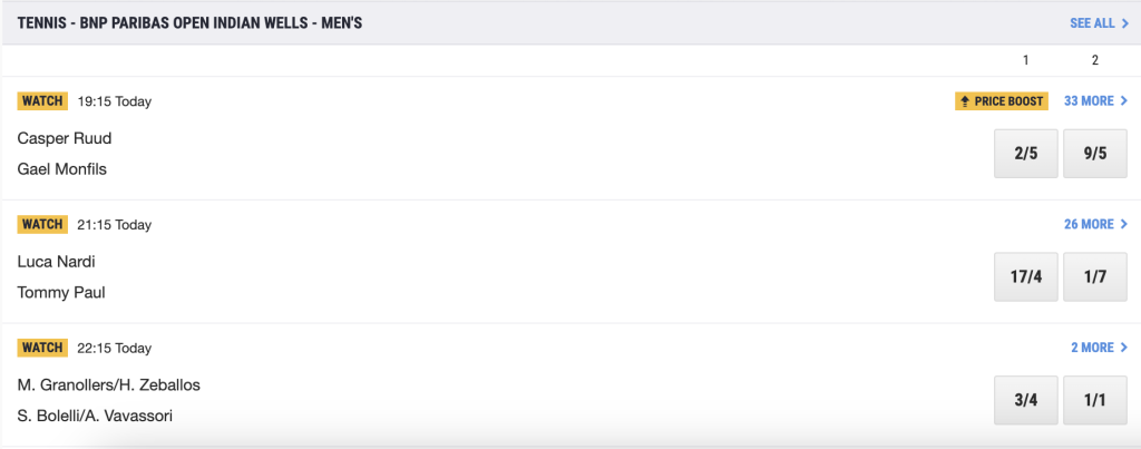 If you are new to the world of betting markets, it’s advisable to start with tennis bets, as there are only two outcomes. Our experts have selected the best coefficients for you to determine your chances of winning. The good news, the Ladbrokes on line platform hosts numerous tennis tournaments around the globe, including the WTA, ATP, and Wimbledon championships.